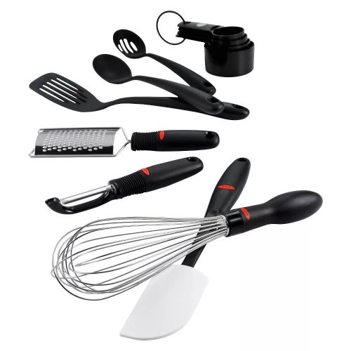 Includes:Peeler, Measuring Spoons, Whisk, Can Opener, Turner, Spatula, Spoon, Measuring Cups, Hand Held Grater, Tongs, Slotted Spoon