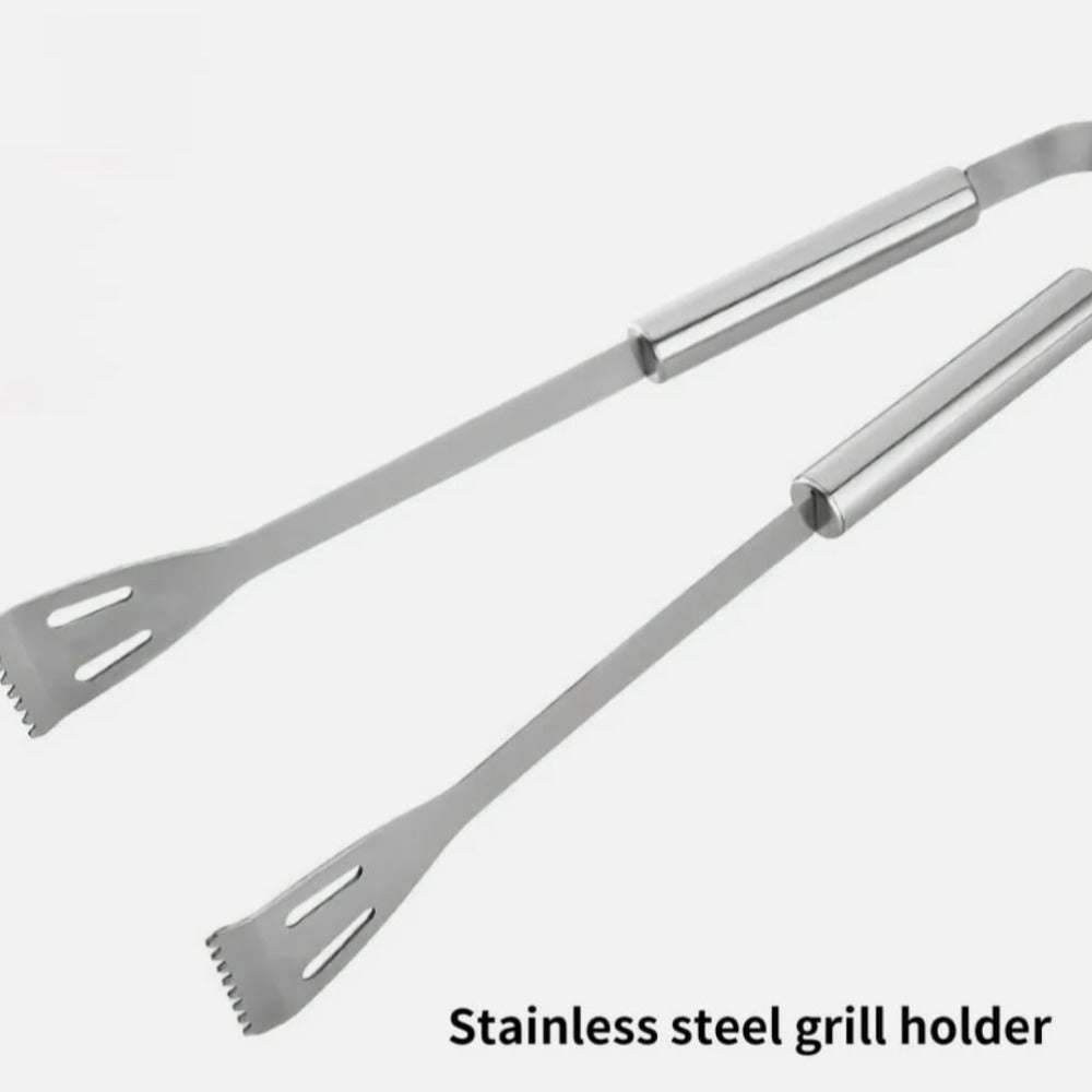The 3 PCS set includesspatula, forkand tongs. The hollowing design of the spatula is make sure the oil from your food will able to drop back into the grill and not on the plate for serving.