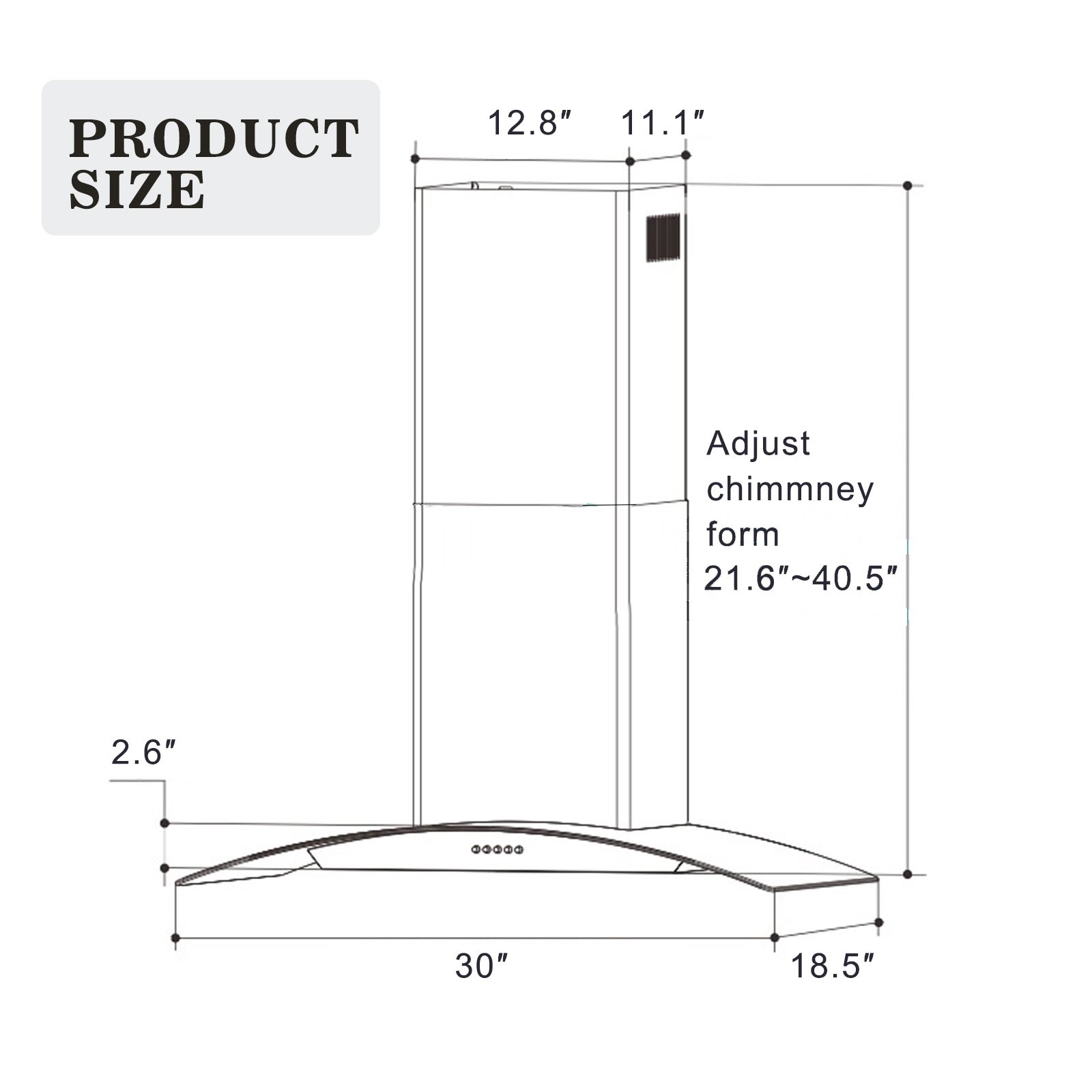 Dimension: 29.5" x 18.5" x 40.5"Chimney Height: Telescopic Chimney Fits 8ft to 9ft ceilingVenting Size: 6" round duct vent exhaust and back draft damperAirflow at Max: 700 CFMLighting: 2 X 1.5W LED LightsNoise Level: 55 dBAVoltage: 120v / 60 Hz standard USA & CANADAMotor: 200W Single Chamber Ultra QuietMount Type: Wall MountSpeeds: 3 SpeedGlass: 6 mm tempered glassKeypad type: Touch control panelFilters: 2 Stainless steel baffle filtersMaterial: Industry Highest quality 430 Stainless SteelCertified: ETL U.S. & Canada CertifiedWith Oil Cup