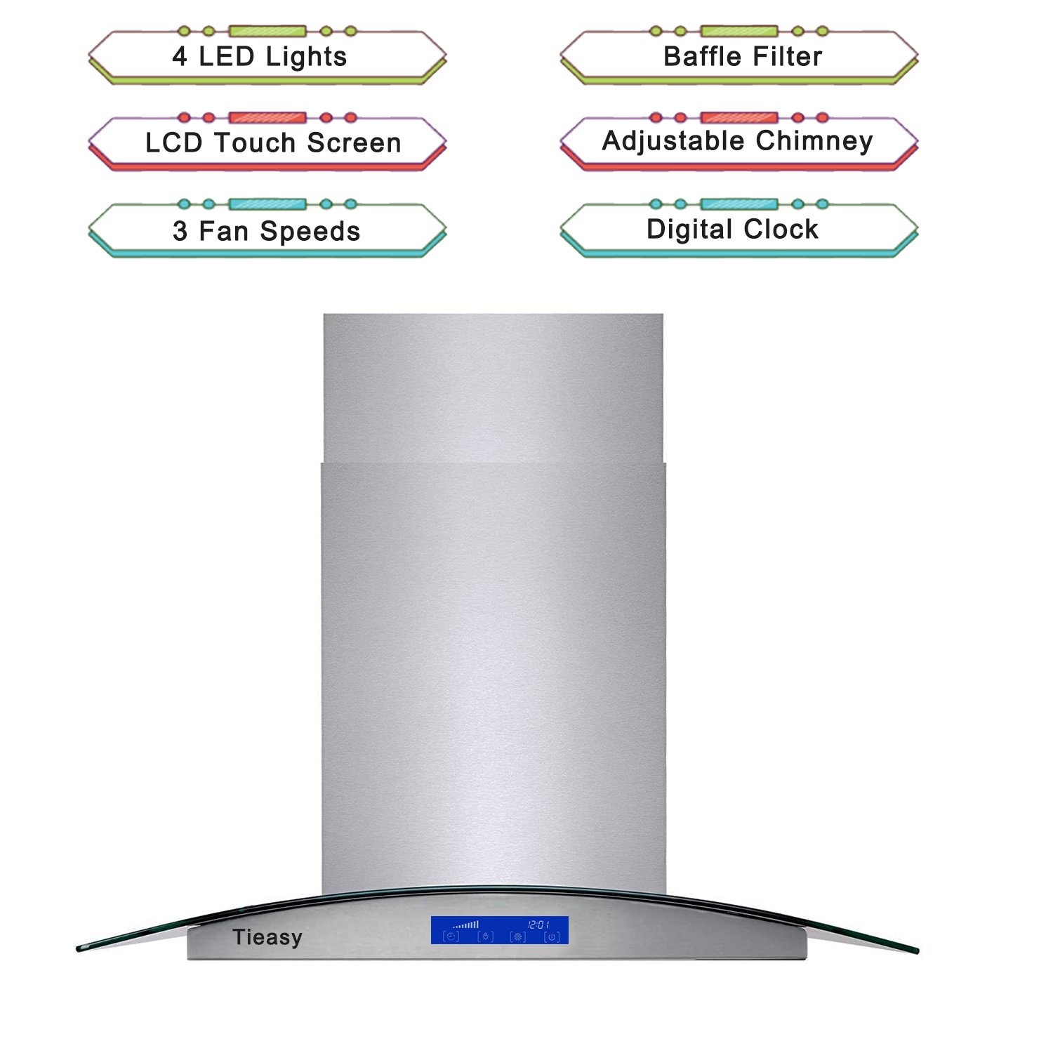 Tieasy Range hood come equipped with everything needed to easily install and use; including two 23.6-inch telescoping chimney pieces; allowing a fit for most ceilings between 7.5 and 8.5 feet.