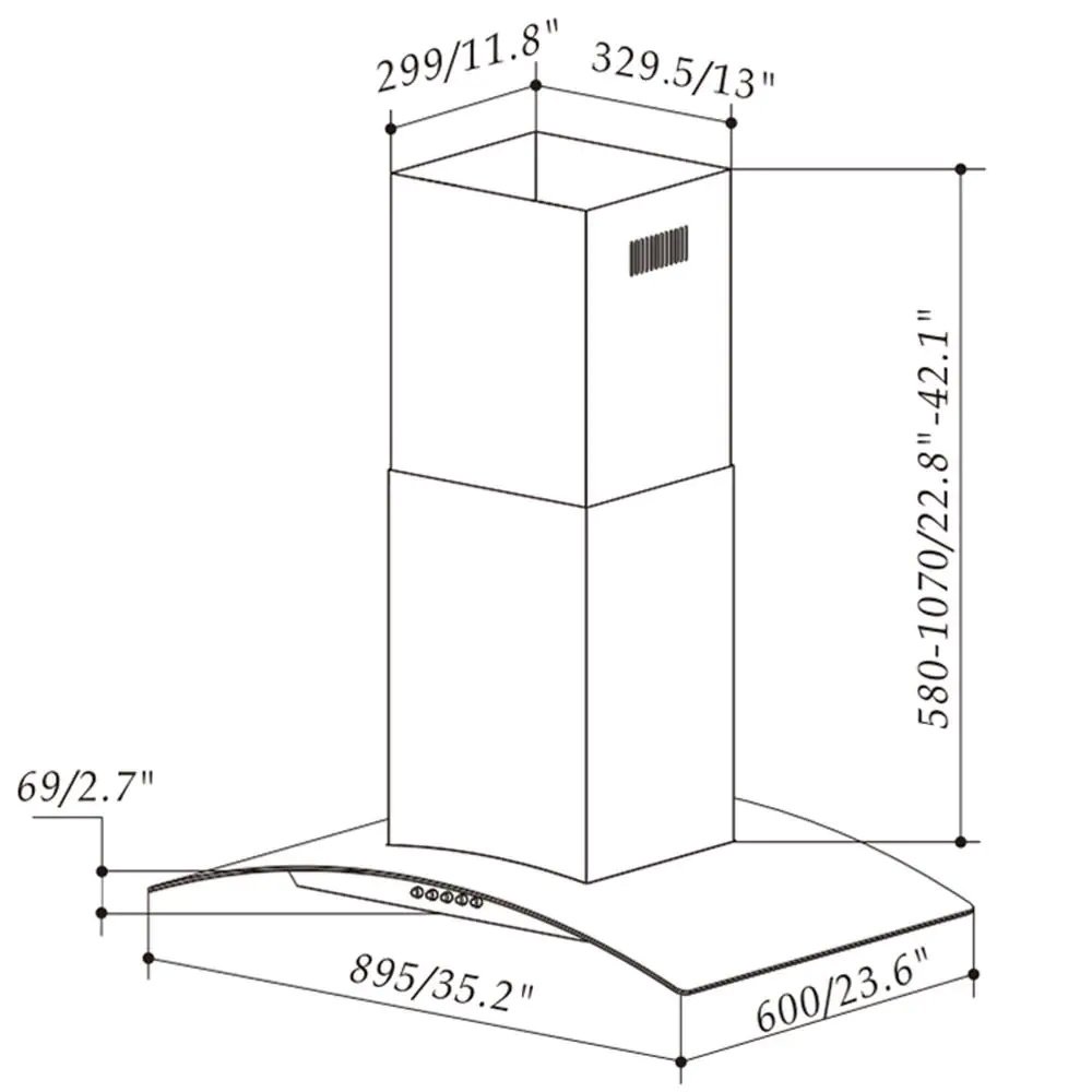 Range Hood Size: 36 inchMounting type: Island Mount (Ceiling)Dimension: 35.2" W x 23.6" L x 44.8" HRequired Ceiling Height: 7.5 to 8.5 ftDuct Size: 6"Airflow: 900 CFMLevel of Speed: 3Control Type: Touch switchNoise Level: Less than 65dbLighting: LEDNumber of Bulbs: 4Bulb Wattage: 1.5 WMotor Wattage: 200 WMaterial: Stainless SteelProduct Finish: Brushed Stainless SteelVoltage: 110-120V 50/60HzFilter Type: Stainless Steel Mesh FilterNumber of Filters: 2Vent Location: TopAluminumexhaust Pipe: 6.6' LongStainless Steel Chimney: 2 x 23.6" LongCertification: ETL Compliance with US and Canada Safety Standards