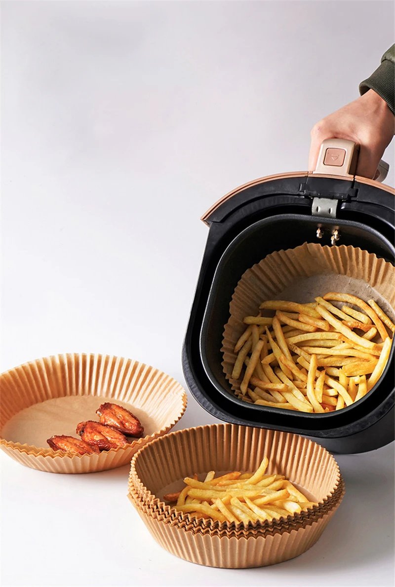 [Air fryer parchment paper lining]:The air fryer is lined with disposable paper to keep the air fryer clean. It is not greasy, maintains the integrity and aesthetics of the food, does not affect the taste of the food, and is light and practical.