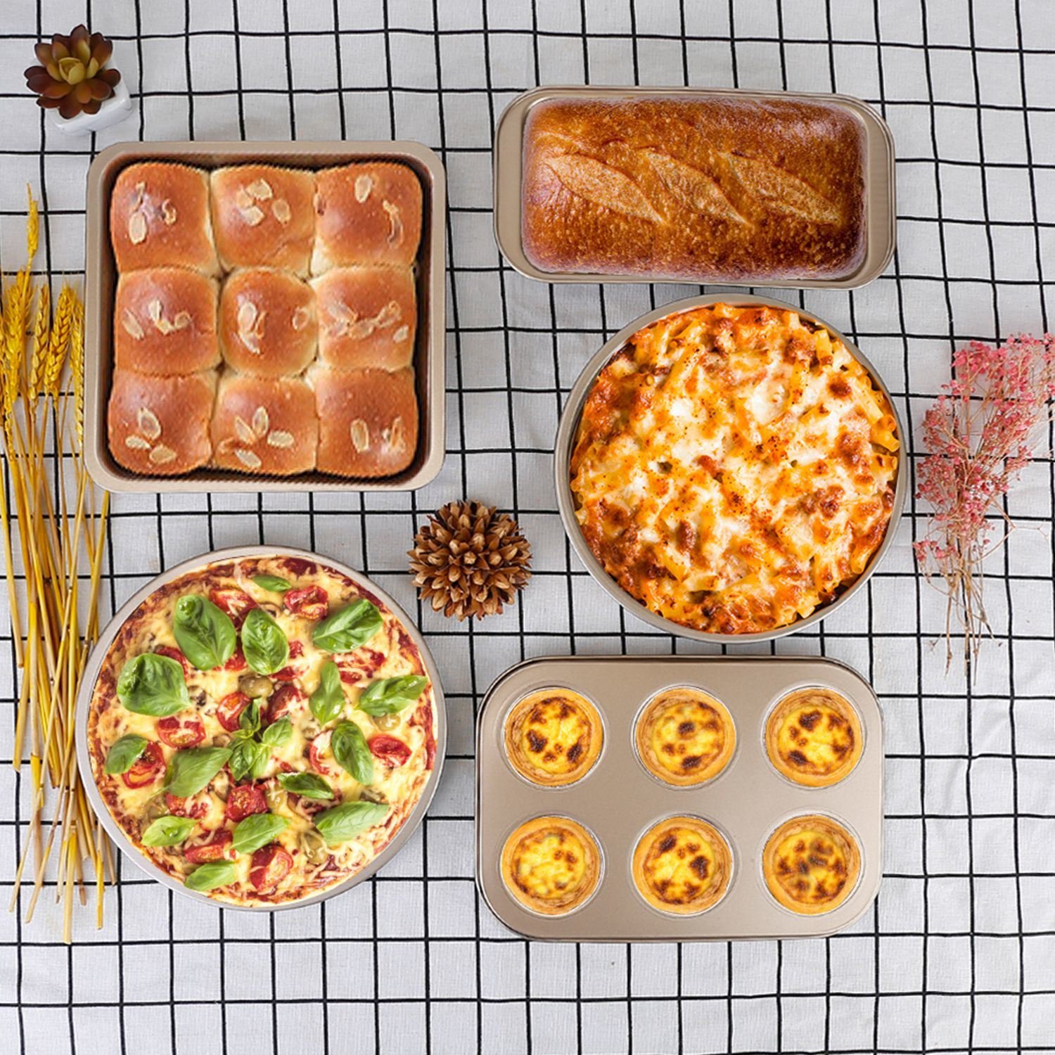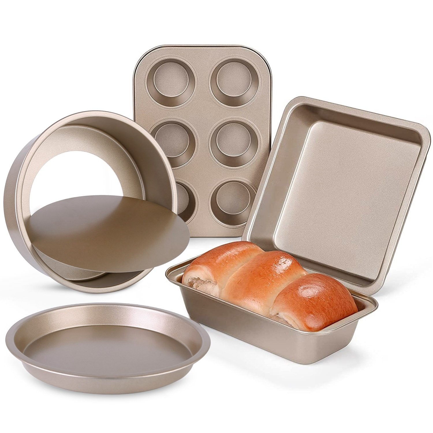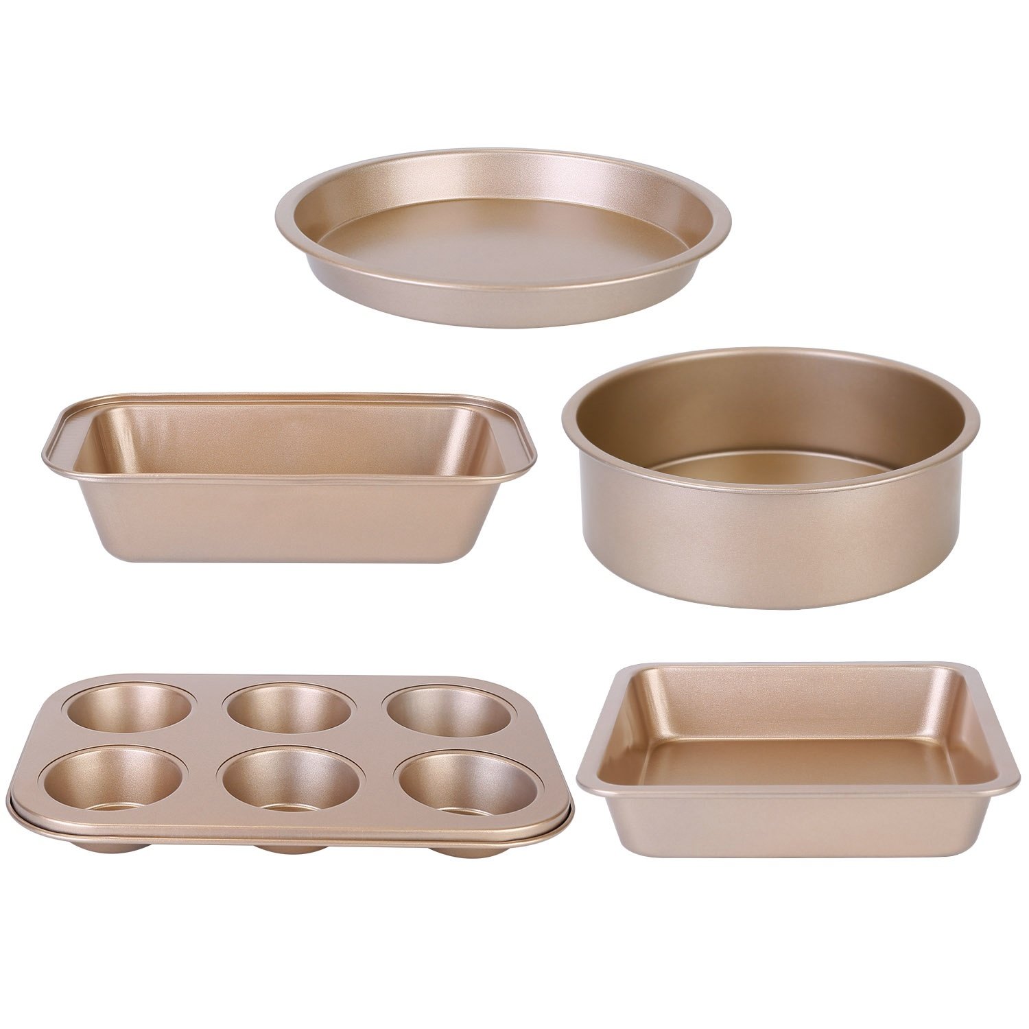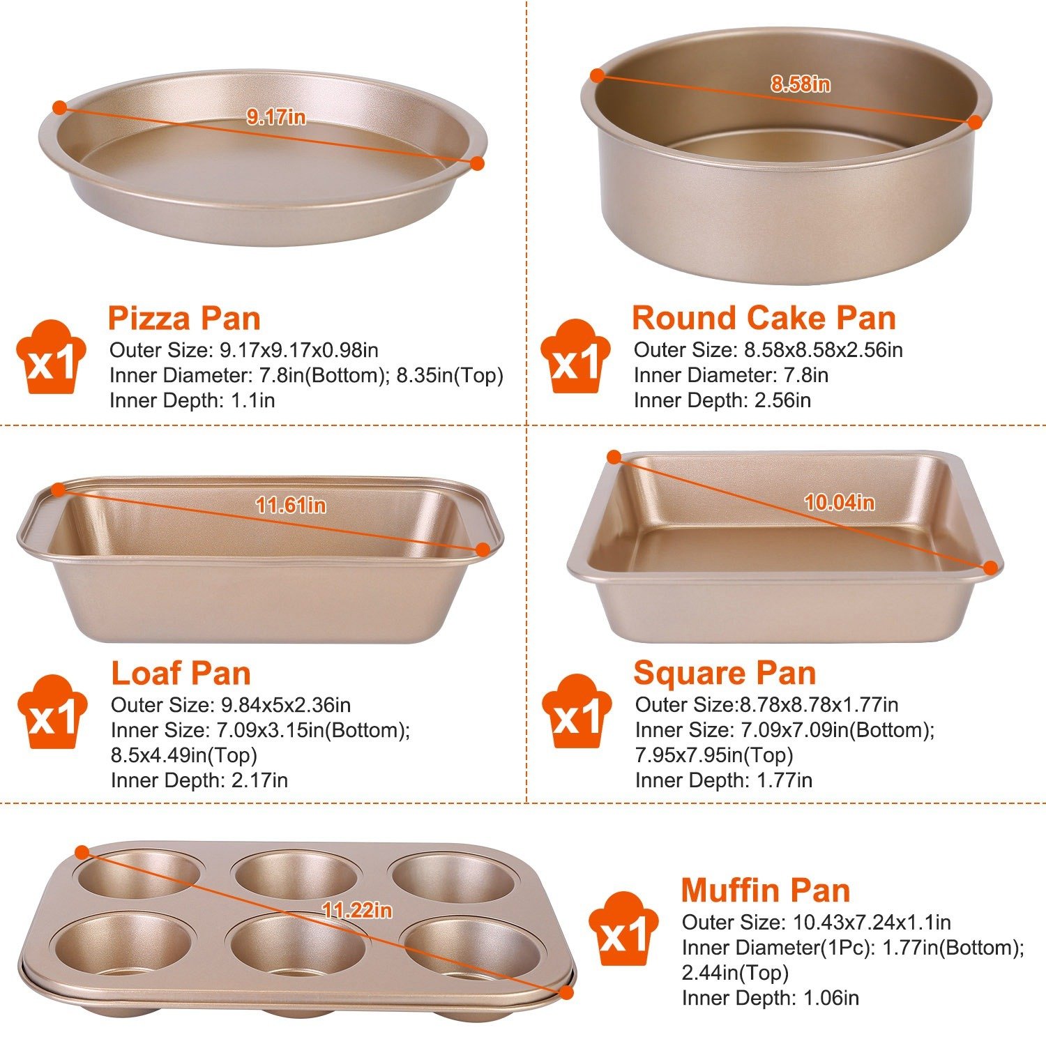 *5Pcs Bakeware Set*:Come with a 10.43x7.24in Muffin Pan,a 8.78x8.78in Square Pan,a 9.84x5in Loaf Pan,a 9.17x9.17in Pizza Pan and a 8.58x8.58in Round Cake Pan to meet your all baking needs.
