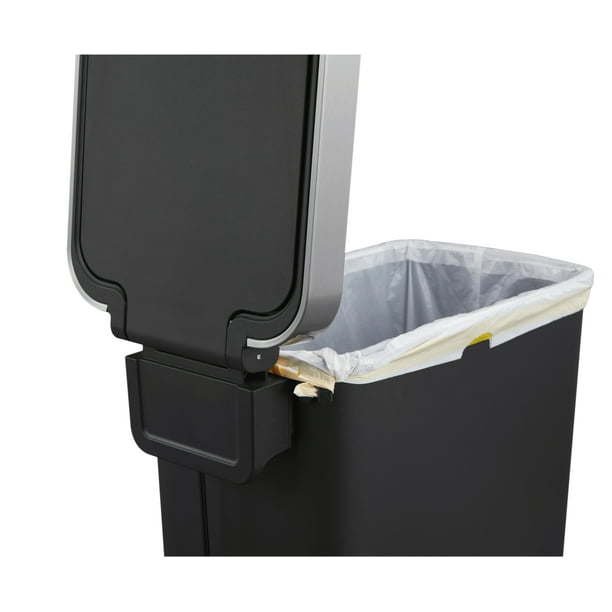 Space-saving Slim Vertical Better Homes & Gardens Rectangular Black Kitchen Step Trash Can. Made of durable plastic resin, this trash can has beautiful stainless-steel accents to enhance your decor. Fits in tight spaces yet still offers a generous 10.5-gallon capacity. Utilizes 13 Gallon trash bags which are hidden from view when installed using the bag fixer tabs. Hidden bag feature with Stainless Steel Rim.