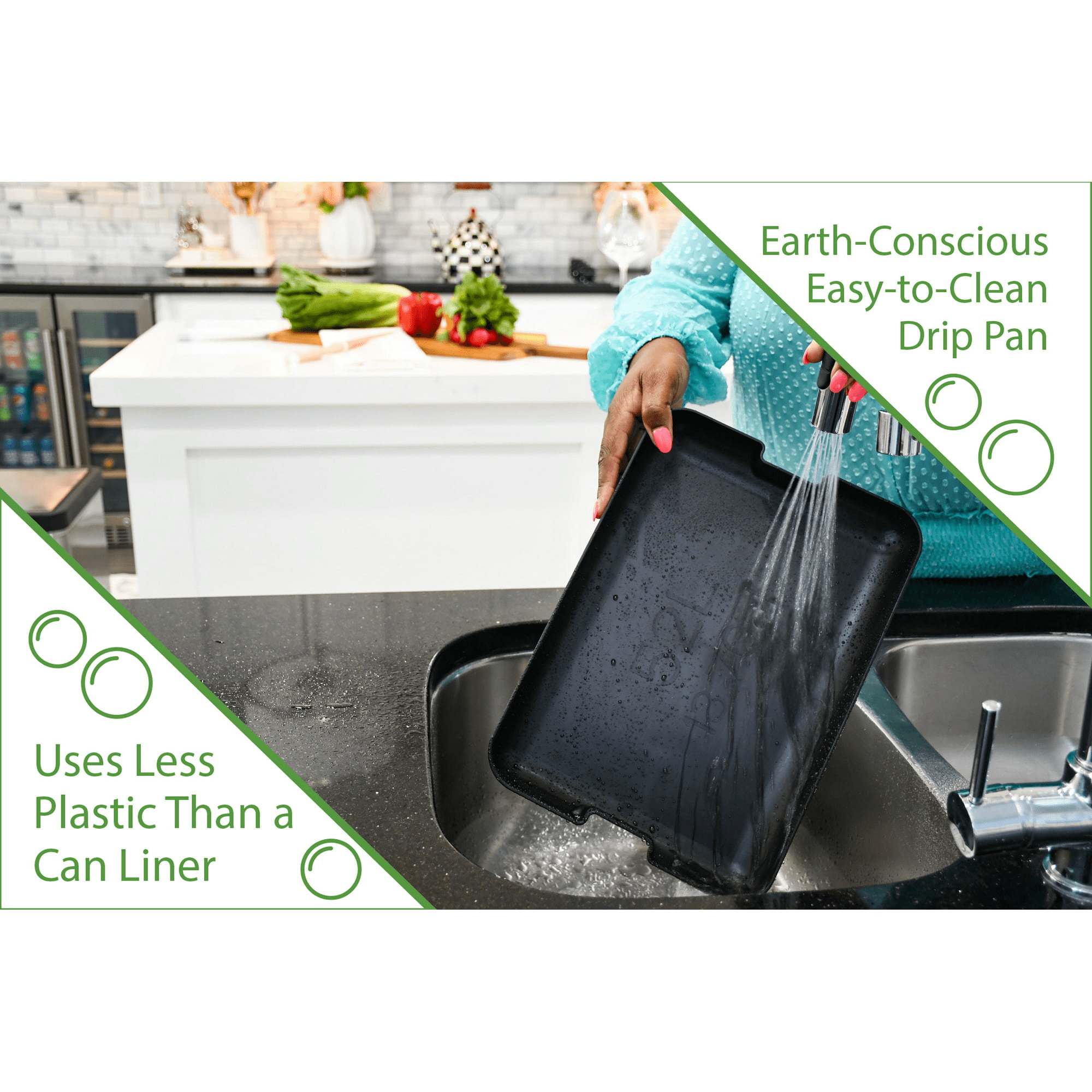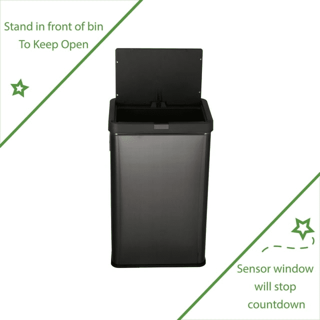 The Better Homes & Gardens hand motion-activated sensor Kitchen Garbage Can, in black, adds a touch of luxury and convenience to any home. This fingerprint- and rust-resistant durable stainless-steel bin features a spacious lid opening, allowing easy disposal of your waist. The convenient stay-open lid motion sensor technology employs dual sensors to pick up your presence in front of the bin and keeps the lid open until you walk away, thereby triggering the visual countdown timer to re-start before closing the lid. This technology helps prevent false lid openings. The hand-motion activated lid provides over 15,000 opening/closing cycles per new 4 "C" battery set (providing the included Use and Care instructions are followed). Batteries are not included.