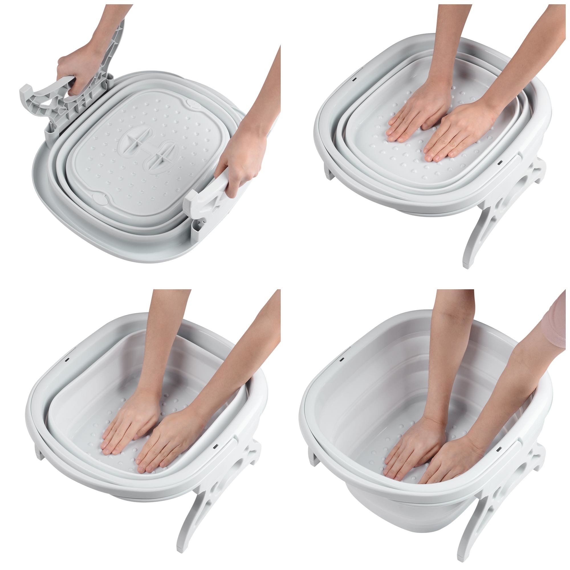 - Foldable for Space Saving - Collapsible foot bath basin with compact folded size of 17 5/16"x15 6/16"x2 12/16" and light weight allows quick storage after use for convenient home foot spa experience & space saving as well as for easy carrying when going travel; With a convenient handle of 44 Lbs load capacity for easily pouring out water and changing the position to anywhere you like when filling with water