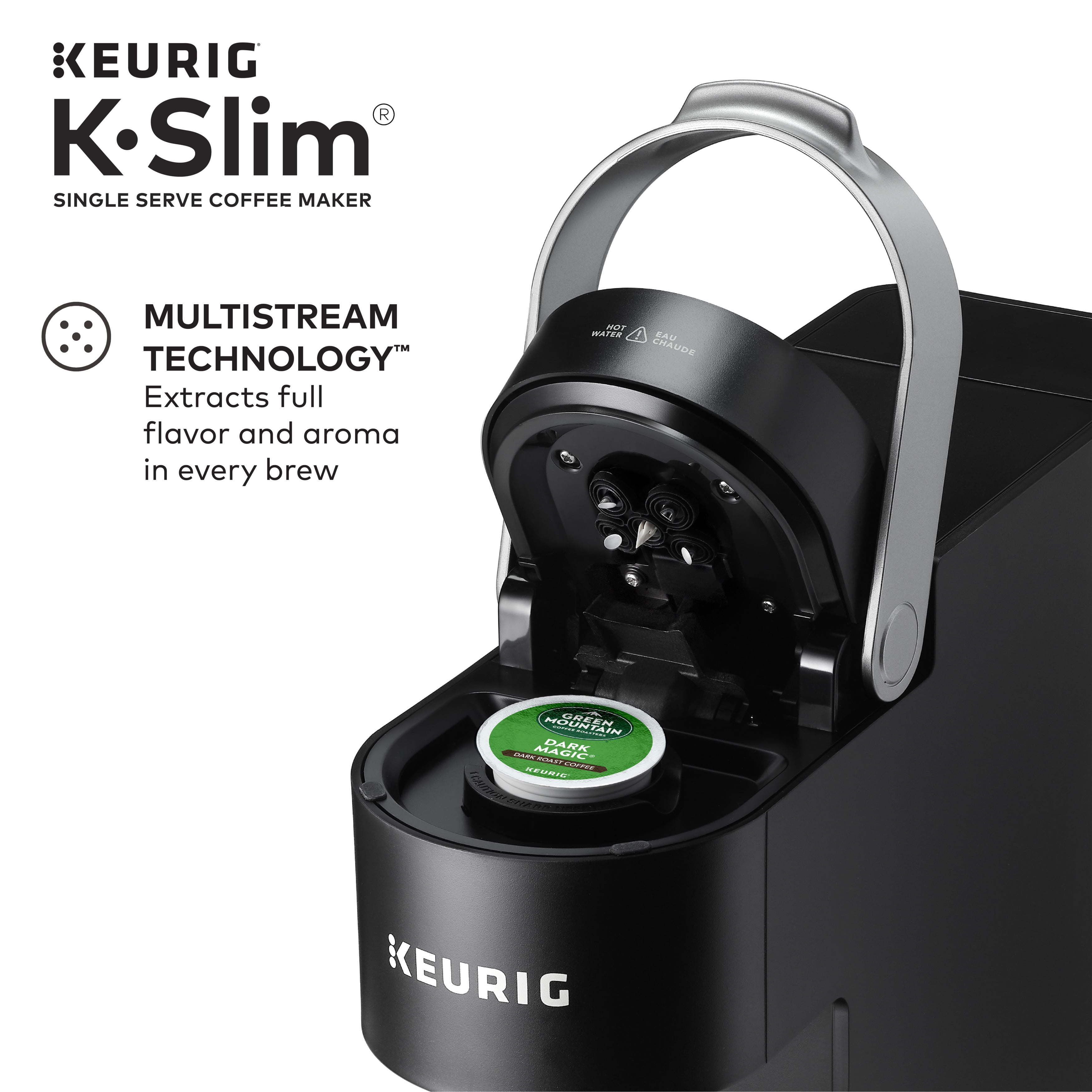 Enjoy ease and great taste in little space with the K-Slim single serve coffee maker. The K-Slim coffee maker features MultiStream Technology, an innovative way to more evenly saturate the coffee grounds* in every K-Cup pod. This technique extracts full flavor and aroma from your K-Cup pod, so you can enjoy an exceptionally flavorful experience every time you brew.At just 5' wide, the K-Slim single serve coffee maker fits neatly on your countertop, making it the perfect choice for when space-saving and simplicity are important. The K-Slim brewer brings together the performance and simplicity that is known for, in a slim and sleek design. You also get the convenience you desire with the capacity to brew up to four 8 oz. cups before refilling the 46 oz. removable water reservoir, and the ability to enjoy a fast and fresh-brewed 8, 10, or 12 oz. cup at the push of a button. Choose from hundreds of flavorful K-Cup pod varieties of coffee, tea, cocoa, and more. With the K-Slim brewer, your delicious morning cup or midday pick-me-up is always ready in minutes, and you never have to sacrifice countertop space for taste again.*vs. leading national K-Classic brewer