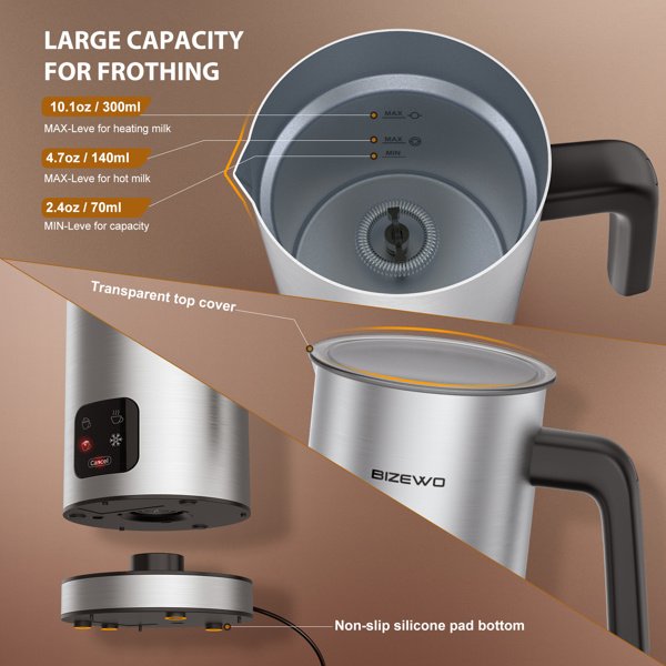 Introductions:4 Functions Milk Machine: The electric milk frother has 4 functions: Hot Dense Foam, Hot Airy Foam, Cold Milk Frother, Heating Milk. Frother function can be used as a milk foamer, hot chocolate maker, tea latte creator. The steamer function is awesome for getting the milk or chocolate to an appropriate 150 ℉ temperatureOne Unit Design: The Automatic milk frother machine is all in one design, stainless steel jug and motor and magnetic whisks are located in the container. Unlike a detachable or handheld milk frother, this milk foam maker is easy to use that all only need to tap one of the four functional modes on the touch screen panel to get hot milk or milk froth as neededQuick and Convenient to Operate: The Electric milk foamer was so easy to use helps people who have zero experience as a barista. Heats up one cup of densely frothy happiness to pour over your milk in 2 minutes, with the buzzer sound the milk frother would automatically stop work once doneEasy to Clean: The Automatic milk frother is made from non-stick stainless steel which is easy to pour and wash, now you don't have to spend a lot of time cleaning this foam maker that is very convenient for busy women. 2 whisks are magnetically operated and pops off easily when pulled which makes cleaning very easy and convenientBig Capacity Share: The stainless steel jug can froth up to 8.5 ounces of milk at once or heat milk or chocolate up to 20 ounces. It's better for you to use this milk foam maker to enjoy coffee with your family and friends with a larger capacity