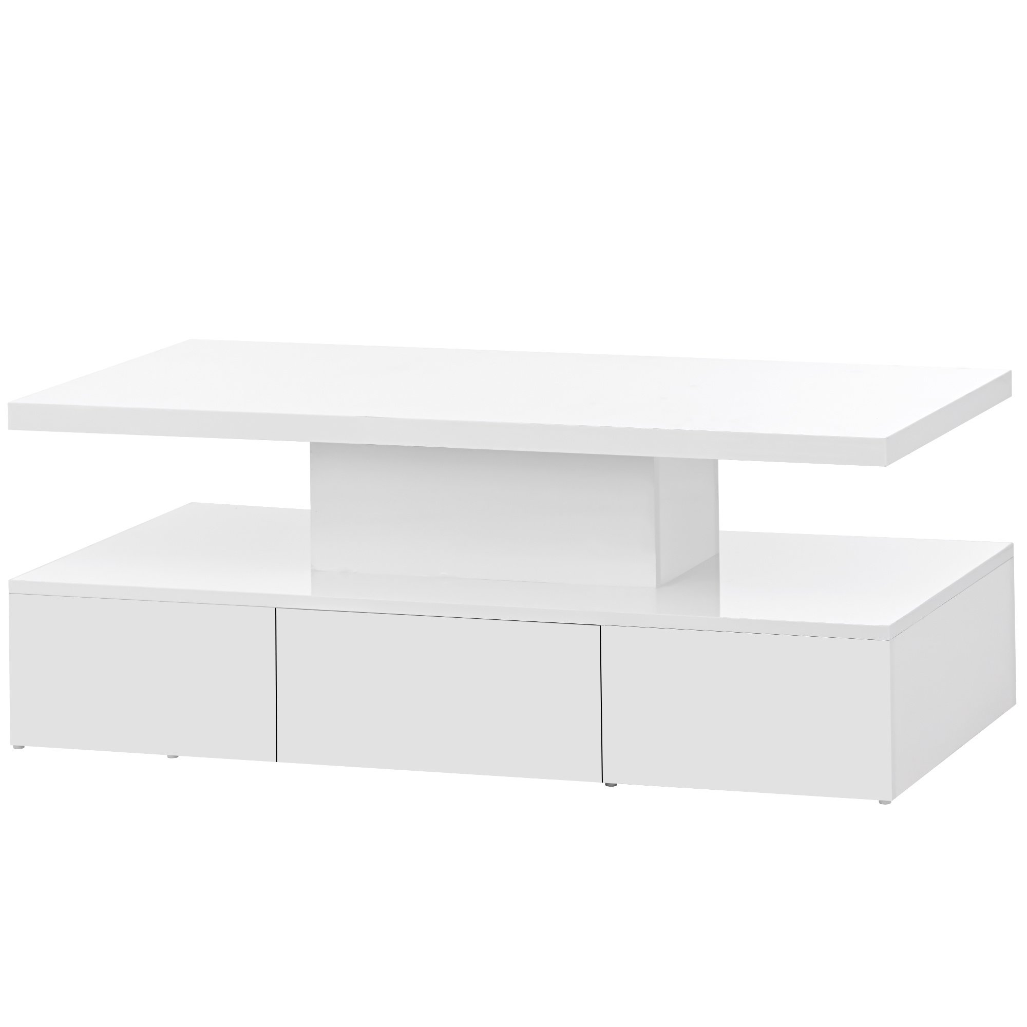 Sturdy Material & Easy AssemblyVery strong particleboard with solid hardware, this table will last a long time in your home. The installation method is also very simple. By following our instructions, you can easily complete the installation within half an hour.Product detailsProduct TypeCoffee TableTop ShapeRectangleTop ColorWhiteTop MaterialParticle boardTop Finish ApplicationVeneerBase ColorWhiteBase MaterialParticle boardBase Finish ApplicationVeneerBuilt-In LightingYesWeight Capacity143lbsDrawers IncludedYesCountry of OriginChinaTable Top Thickness1.18inchClearance - Floor to Bottom0inch