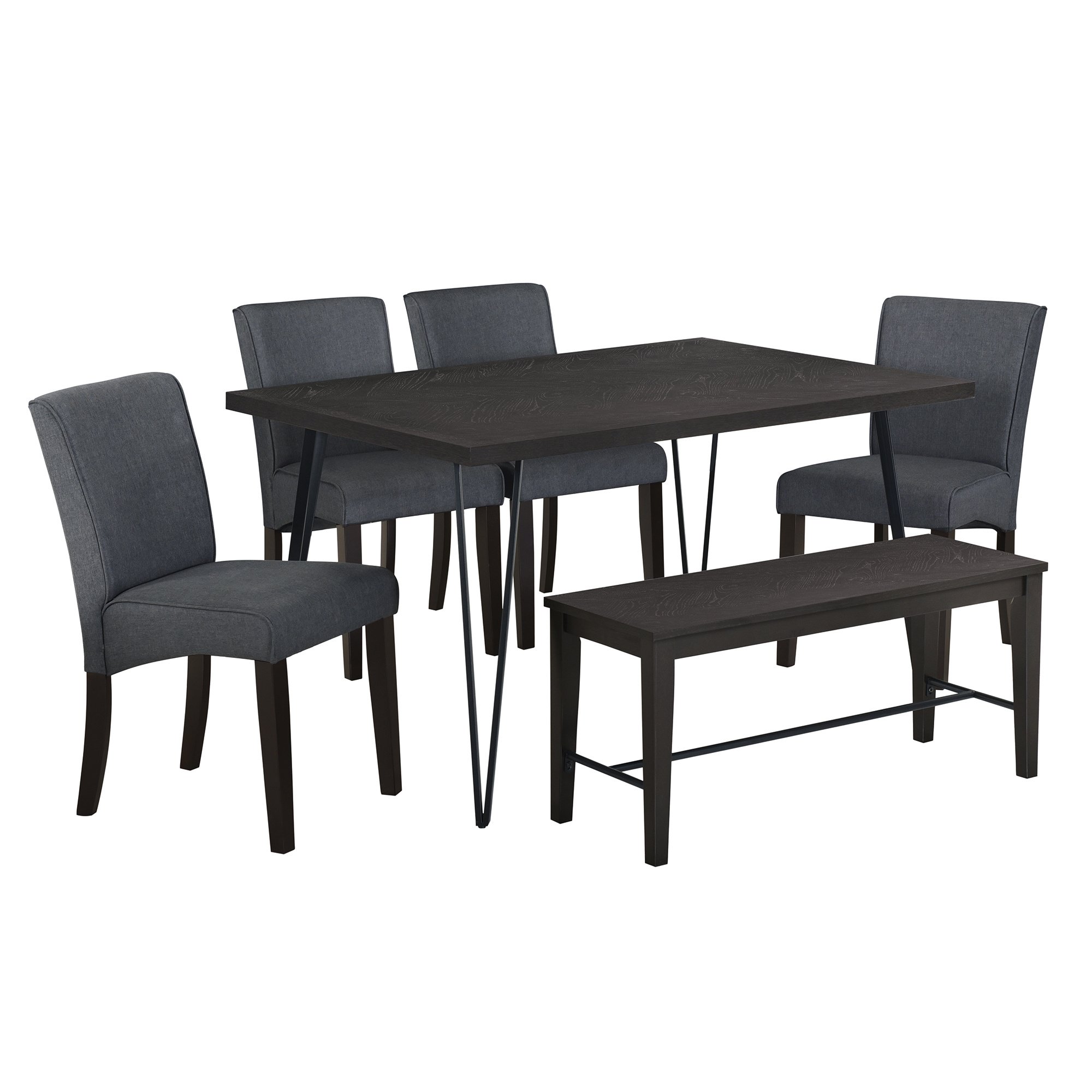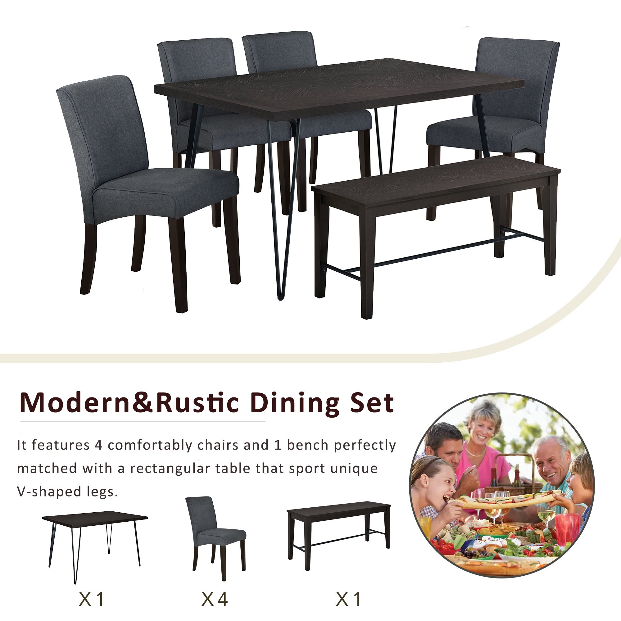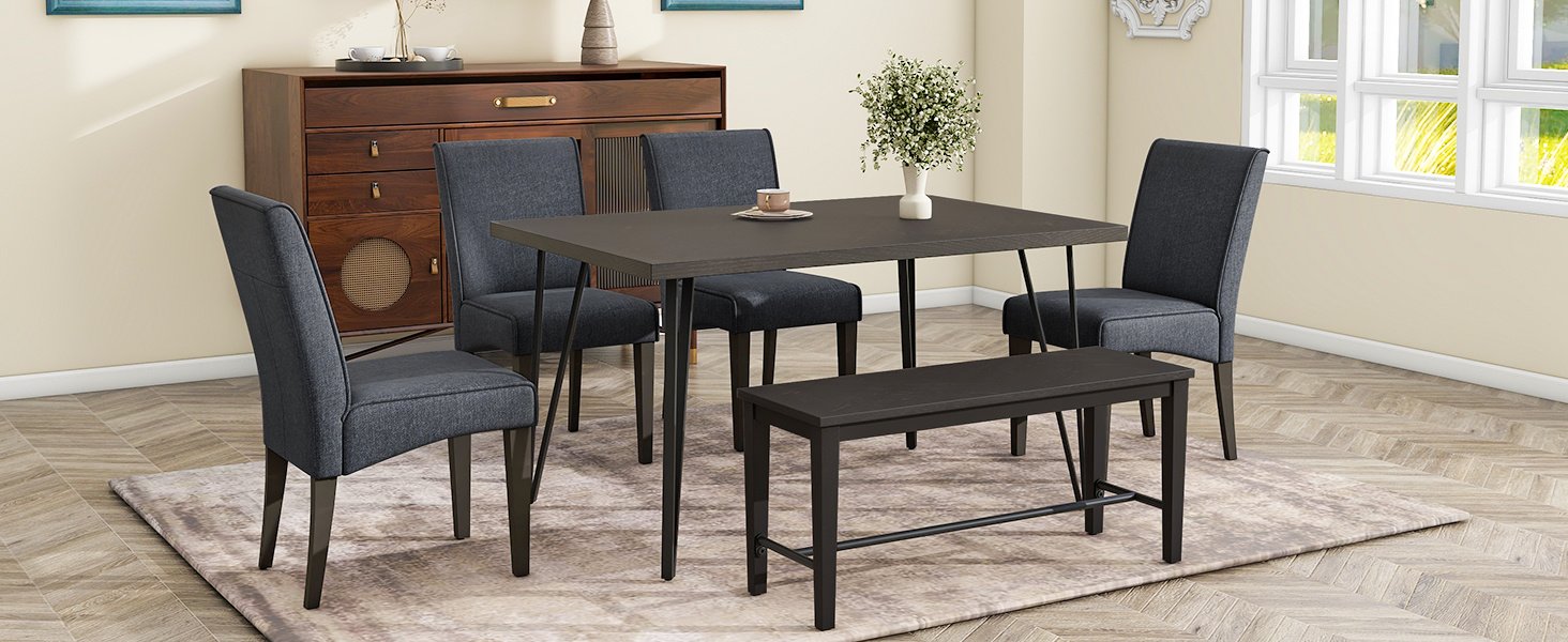 Modern&Rustic Dining Set for 6This stunning 6-piece dining set boasts a combination of sleek design and functionality. It features 4 comfortably chairs and 1 bench perfectly matched with a rectangular table that sport unique V-shaped legs. The rich texture tabletop and bench top add a touch of opulence to any dining space.