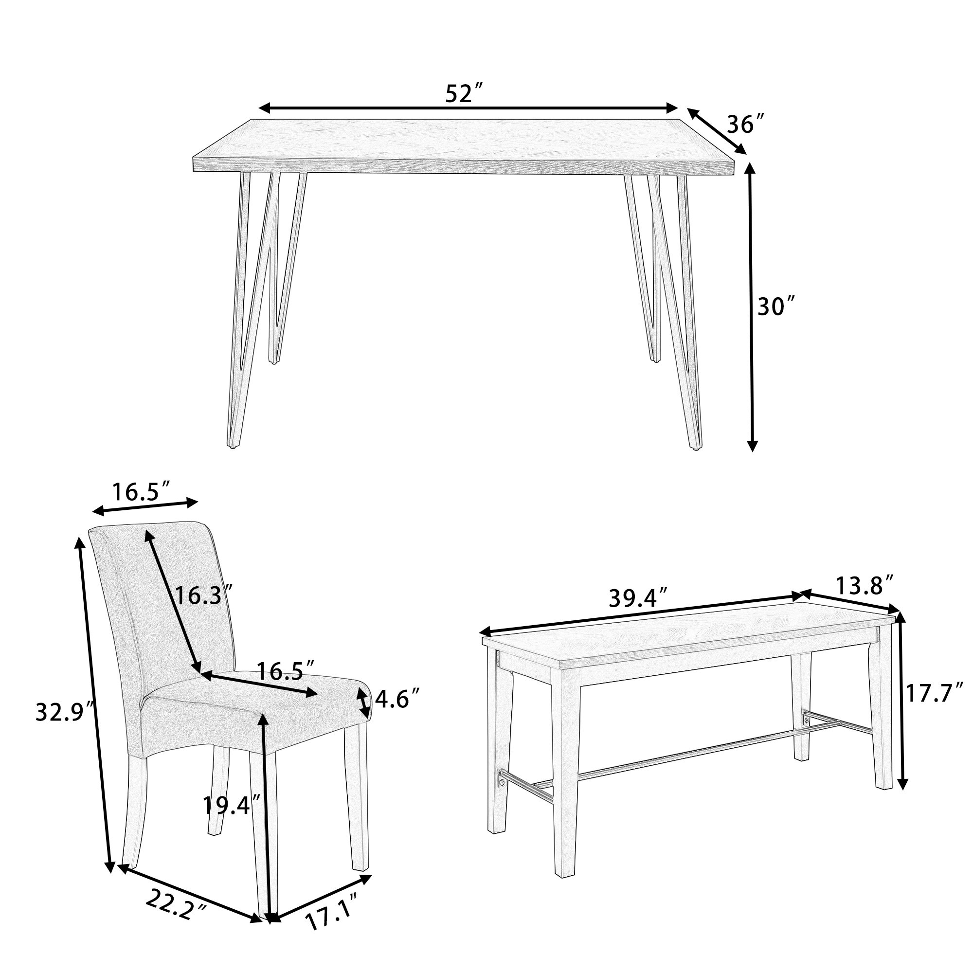 [Dimension&Warranty]Table:52x36x30inch(LxWxH); Tabletop thickness:1.2inch; Chair:17.1x22.2x32.9inch(LxWxH);Seat to ground: 19.4inch. Bench: 39.4x13.8x17.7inch(LXWXH). 2 boxes in total which may not come together. Warm notice:the color of the product may slightly vary due to monitor settings.Please feel free to contact us if any issues.